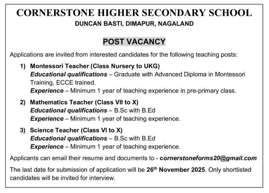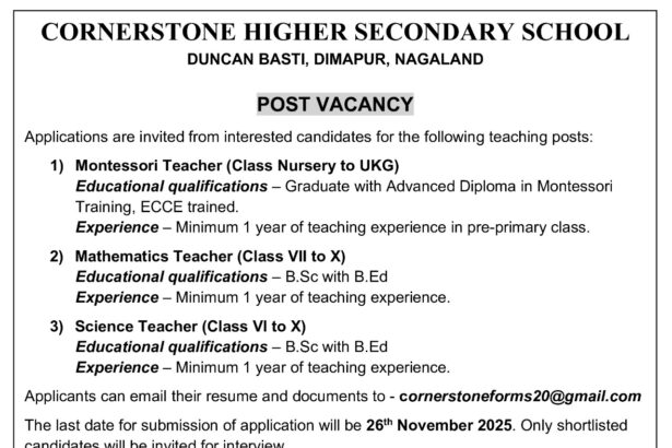 Teaching Vacancies at Cornerstone Higher Secondary School, Dimapur